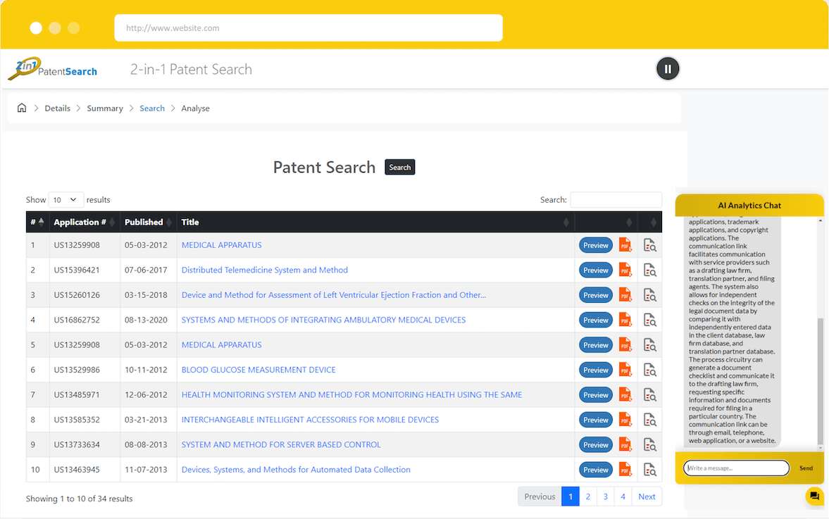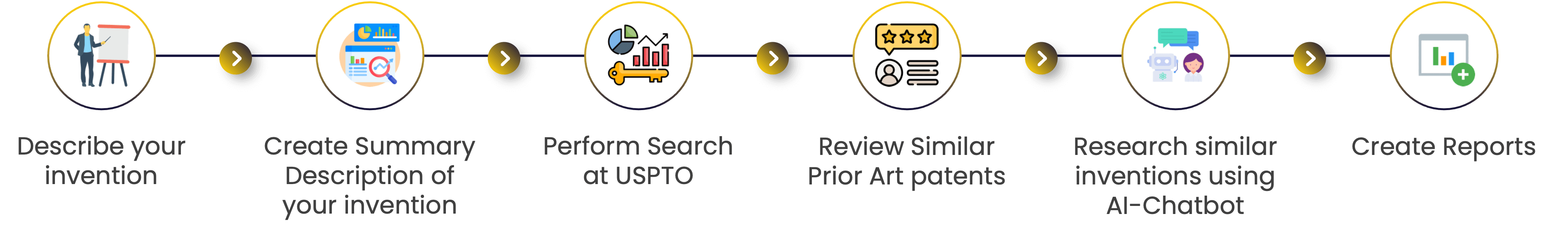 An integrated search engine directly interfacing with the USPTO database, coupled with an AI-assisted analytical chatbot, facilitates thorough prior art searches and in-depth analysis of identified similar inventions.